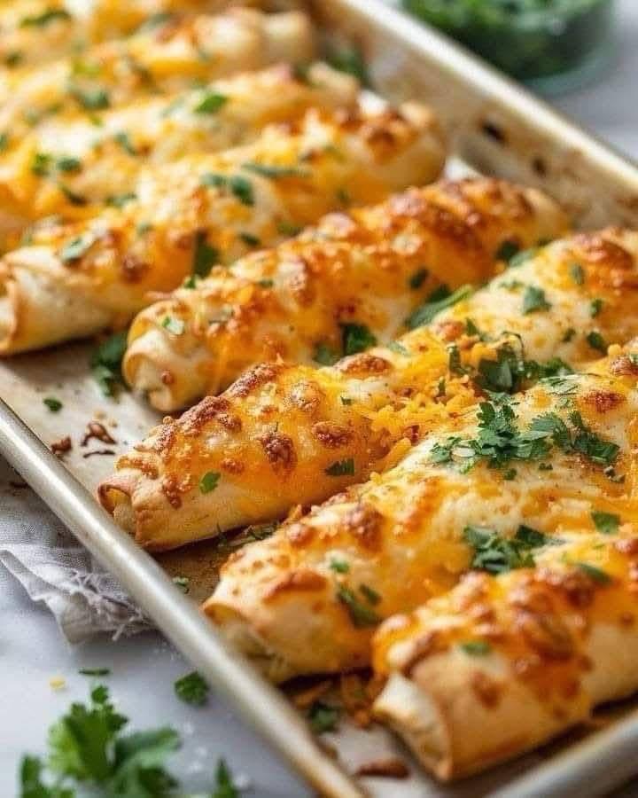 These look amazing — they appear to be baked cheesy chicken enchiladas or cheesy burritos topped with melted cheddar and Monterey Jack cheese, finished with fresh chopped cilantro. Based on the golden brown finish and the rolled tortilla shapes, here’s a recipe recreation inspired by this delicious image: