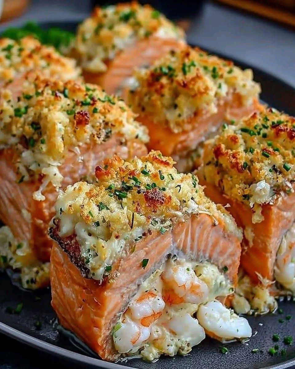 This recipe involves creating a pocket in the salmon fillets, stuffing them with a shrimp mixture, and topping them with a flavorful crust.