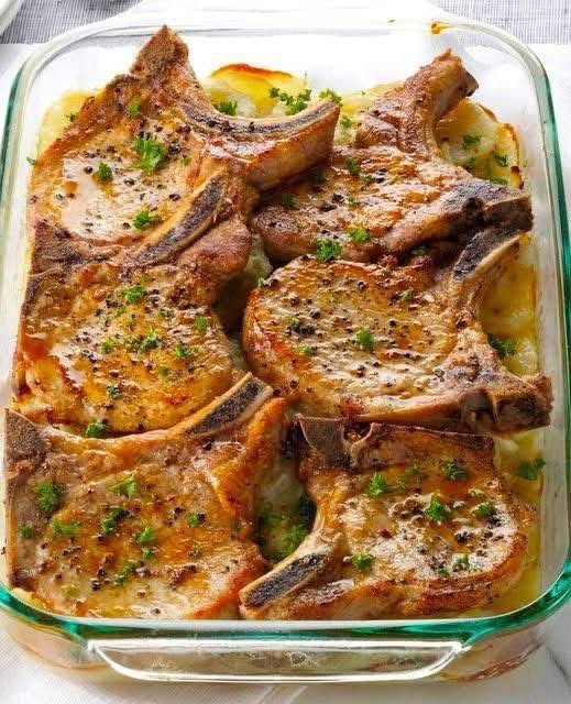 Layer pork chops over scalloped potatoes, sprinkle with cheese, and bake until bubbly.