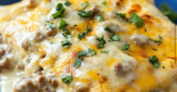 A delightful breakfast dish combining savory sausage gravy, scrambled eggs, and cheese rolled in tortillas for a hearty start to…