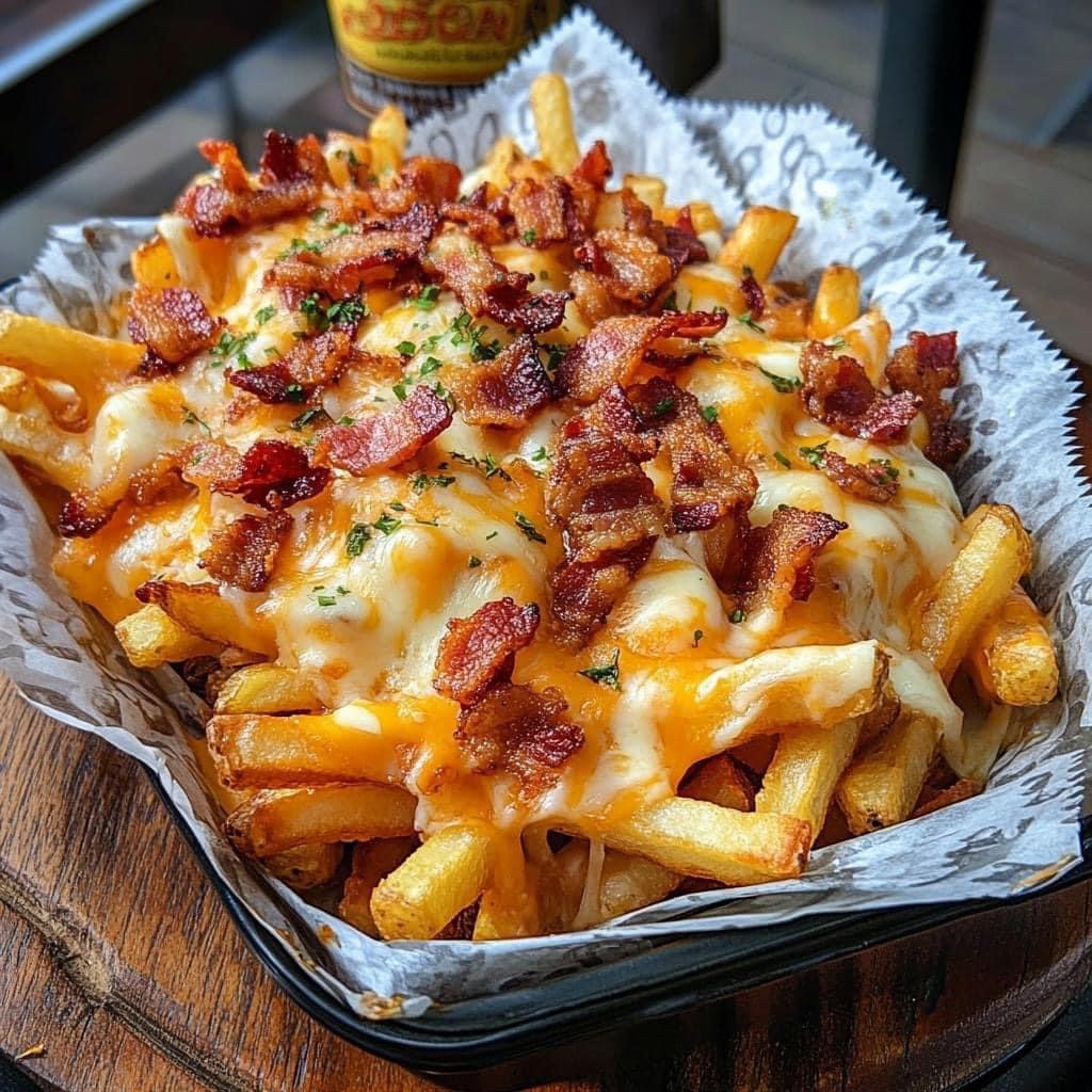 Add Cheese & Bacon: Sprinkle a generous amount of cheddar and mozzarella cheese over the fries, followed by crispy bacon bits.