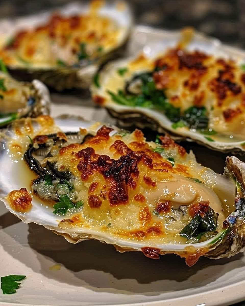 • Bake the oysters in the preheated oven for 10-12 minutes, or until the topping is golden brown and the oysters are cooked through.